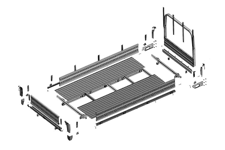 La bandeja consiste principalmente en un bastidor de perfil de aluminio de alta resistencia, una base de aluminio y raíles laterales articulados de aluminio, lo que da lugar a una estructura general robusta y fiable. El material de aluminio no solo reduce el peso del vehículo, sino que también resiste eficazmente el óxido, la oxidación y las condiciones meteorológicas adversas durante un uso prolongado, lo que lo hace especialmente adecuado para entornos de transporte con cargas y descargas frecuentes y operaciones prolongadas al aire libre.