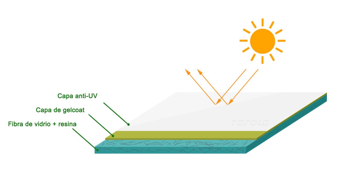 Para las láminas de FRP utilizadas en aplicaciones al aire libre, el gelcoat con inhibidores de rayos UV agregados proporciona una mayor resistencia a la intemperie y una vida útil más larga. El FRP es menos susceptible a la decoloración o al envejecimiento incluso con una exposición prolongada a la luz solar.