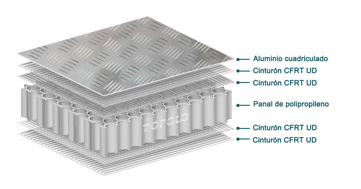 Este panel compuesto combina una lámina de aluminio antideslizante a cuadros con un núcleo de nido de abeja de polipropileno (PP) termoplástico, unido con adhesivo estructural de alta resistencia. Representa la fusión perfecta de la durabilidad del metal y el rendimiento ligero del compuesto de polímero.