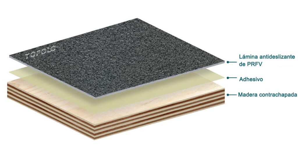 • Estructura tipo sándwich: Lámina antideslizante de PRFV + contrachapado impermeable.