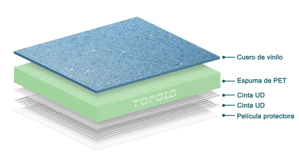 - Material del núcleo: espuma PET (tereftalato de polietileno). (Densidad: 100kg/m³).