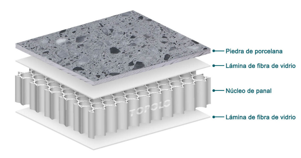 Estructura del panel: Piedra porcelánica + lámina de fibra de vidrio + núcleo de nido de abeja de PP.