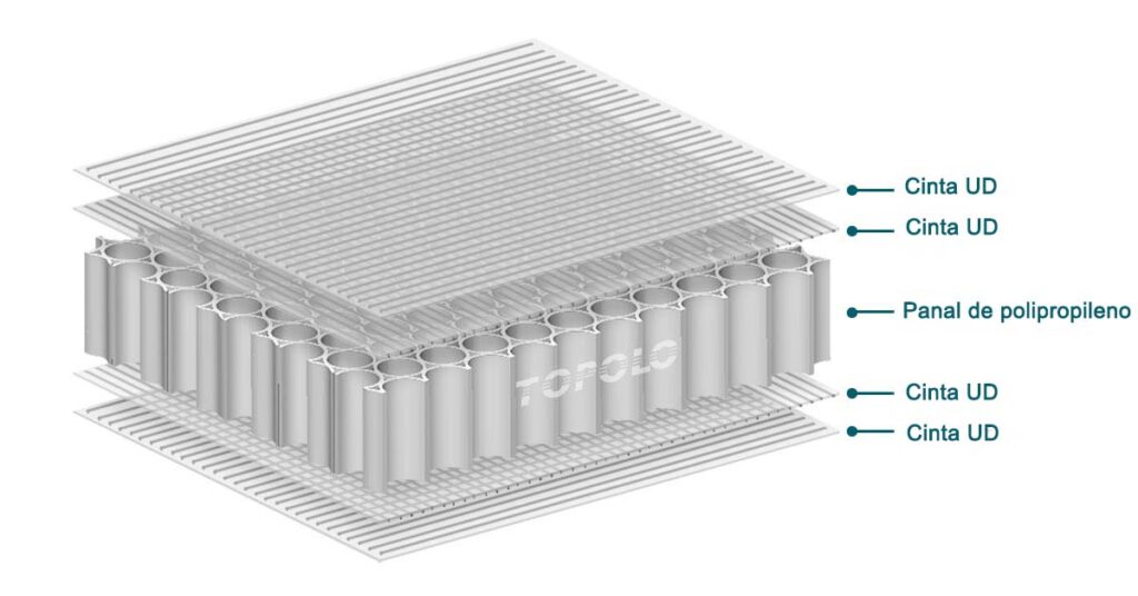 - Núcleo: Panal de polipropileno (PP). (Densidad: 80-120kg/m³)
