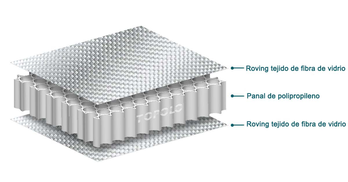 Al combinar fibras tejidas de fibra de vidrio y panal de polipropileno, se crea un panel con integridad estructural y ligereza. Se utiliza en industrias que requieren materiales ligeros y de alta resistencia, como la aeroespacial, la automovilística y la construcción.