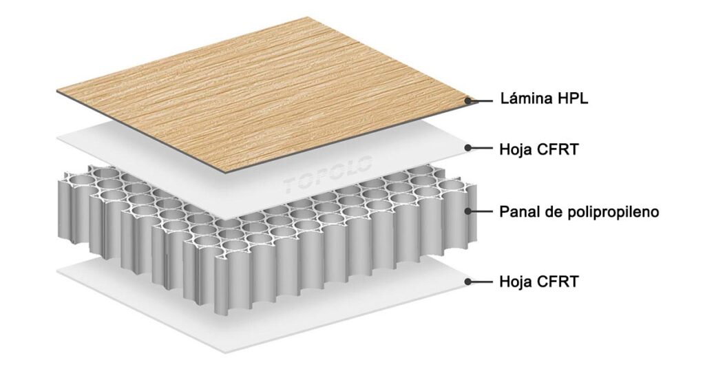 - Núcleo: nido de abeja de polipropileno de 80 kg/m³.