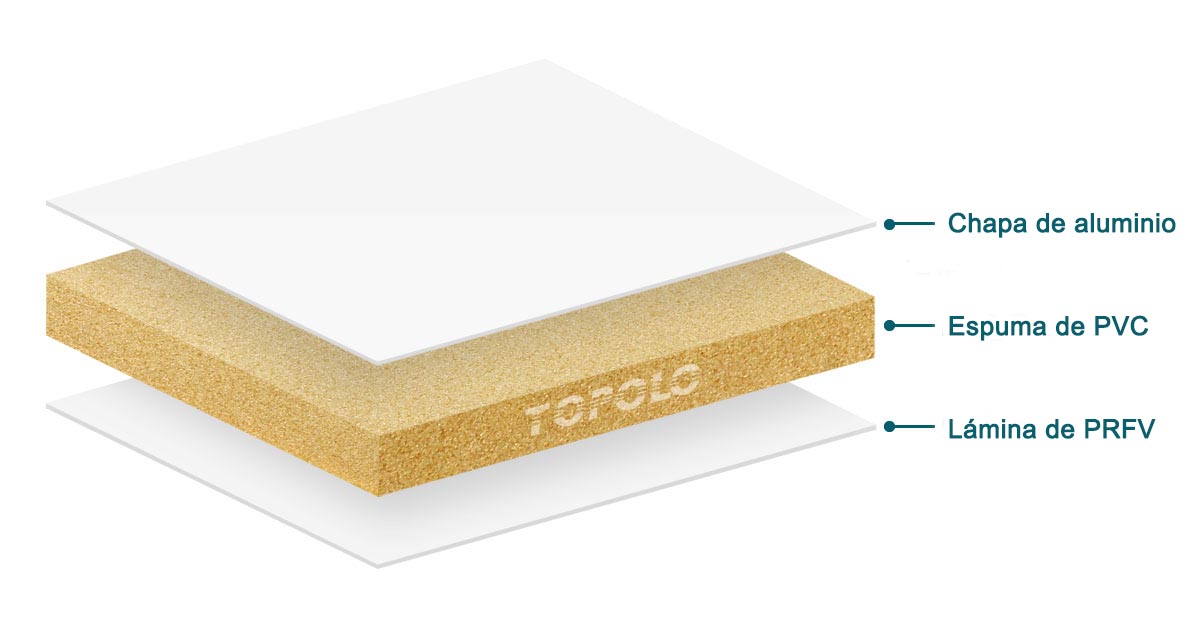 - Material del núcleo: espuma de PVC (cloruro de polivinilo). (Densidad: 40-250kg/m³)