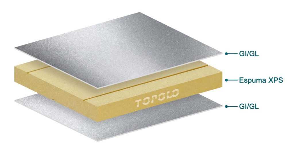 | Piel | Chapa GI (acero galvanizado). Chapa GL (acero Galvalume). Chapa de acero PPGI (Galvanizado Prepintado). Chapa de acero PPGL (Galvalume prepintada). |