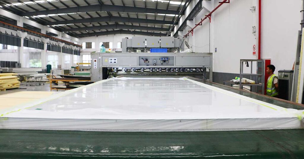 Muchos paneles sándwich de fibra de vidrio para vehículos recreativos presentan problemas como deformaciones y delaminación, que se deben a que el material del núcleo y la piel no se combinan completamente durante el proceso de composición del panel. Nuestros paneles sándwich para vehículos recreativos se componen en un entorno de vacío a alta presión y el pegamento se distribuye uniformemente entre el material del núcleo y la piel. Nuestra gran plataforma operativa permite fabricar paneles más grandes y planos con un ancho máximo de 3,2 m y una longitud máxima de 12 m, de modo que cada lado de la carrocería del vehículo recreativo está compuesto por un solo panel compuesto. Toda la carrocería del vehículo recreativo consta de un panel frontal, un panel trasero, un panel izquierdo, un panel derecho, un panel de techo, un piso y varias particiones, lo que hace que el trabajo de ensamblaje sea sencillo.