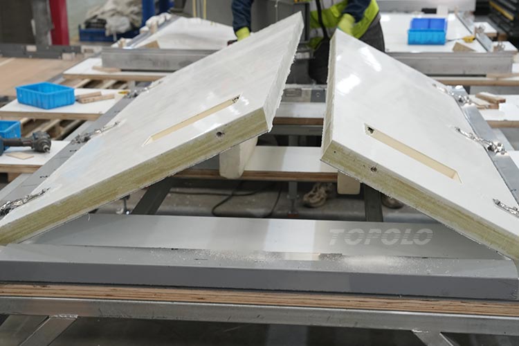 • La piel exterior es una lámina de PRFV/PRFV (plástico reforzado con fibra de vidrio) resistente a la intemperie. Este material es liviano y fuerte, efectivamente resistente a los rayos UV, la lluvia, las bajas temperaturas y otras condiciones ambientales adversas.