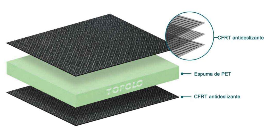 antideslizante La capa antideslizante es un material compuesto CFRT (termoplástico reforzado con fibra continua) con una densa textura antideslizante.